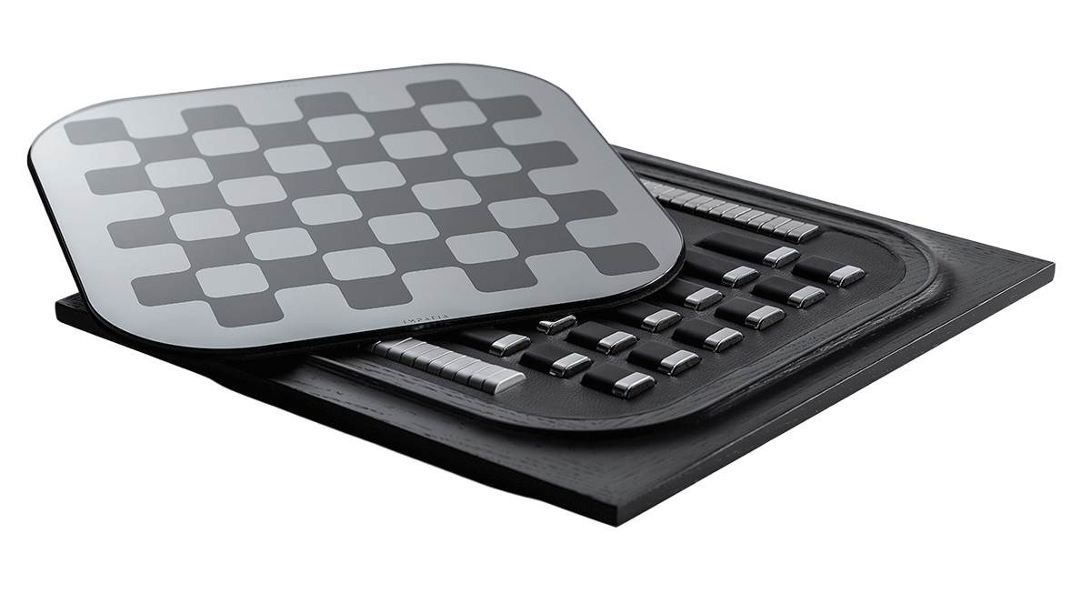 DESIGNED BY IMPATIA R&D, the Mossa is our first chess set that blends fluid shapes with bold design, turning strategy into art. The set is housed in a refined Walnut wooden base combined with mirrored glass, creating a striking contrast of materiality and reflection. Crafted from wood, leather, glass, and metals, each piece elevates the gaming experience, merging tradition with innovation in every move.